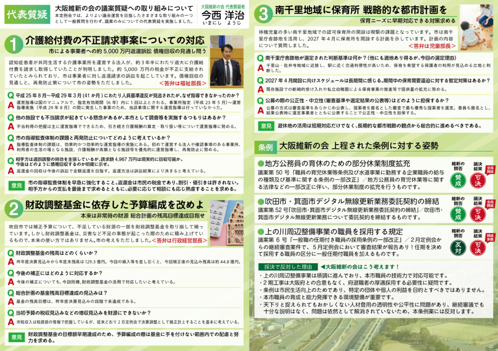 5月定例会が7月2日に閉会し、大阪維新の会吹田市議団の広報誌「令和7年(2025年)5月の定例会号」を作成いたしましたので、掲載しておきます。(ずいぶん前の分ですが、掲載し忘れていたので、こっそりとアップしておきます…。)