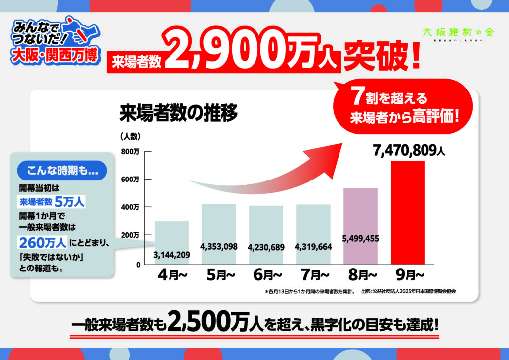 しかし、その後来場者数は順調に推移し、特に9月には7,470,809人を記録するなど、目標を大きく上回る結果となりました。