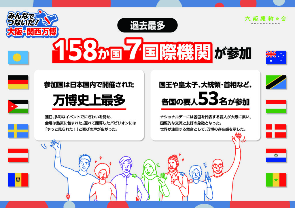 • 参加国は158か国、7国際機関にのぼり、これは日本国内で開催された万博史上最多の参加国数です。