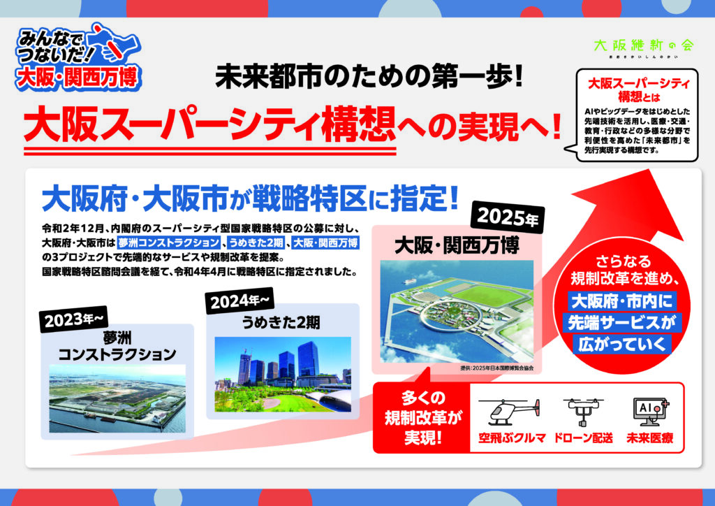 この戦略特区指定により、さらなる規制改革が進められ、空飛ぶクルマ、ドローン配送、未来医療といった先端サービスが大阪府・市内に広がりつつあります。