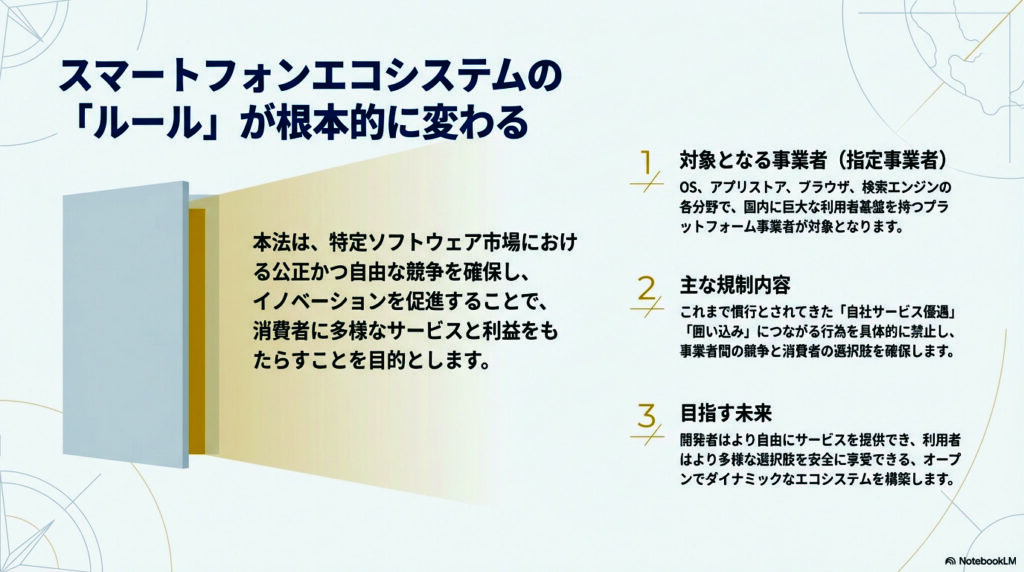 今回は先日から施行された「スマホソフトウェア競争促進法」について、NotebookLMを使って、要約とスライド(PDF⇒画像に変換)して、解説の記事を書きました。