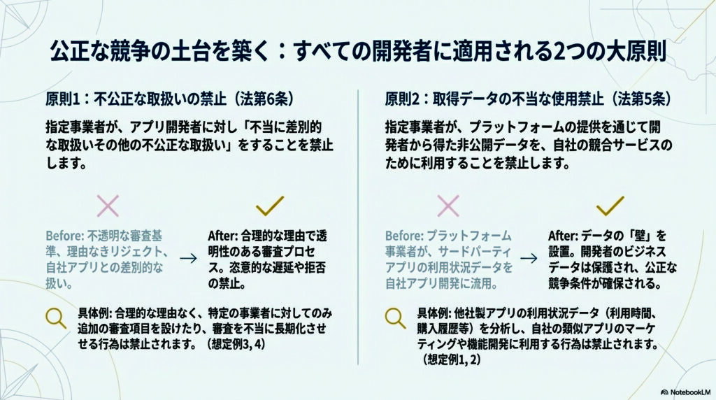 具体的には、指定事業者が取得したデータの不当な使用や、他の事業者に対する不公正な取り扱い、代替アプリストアの排除などを禁止行為として明示しています。
