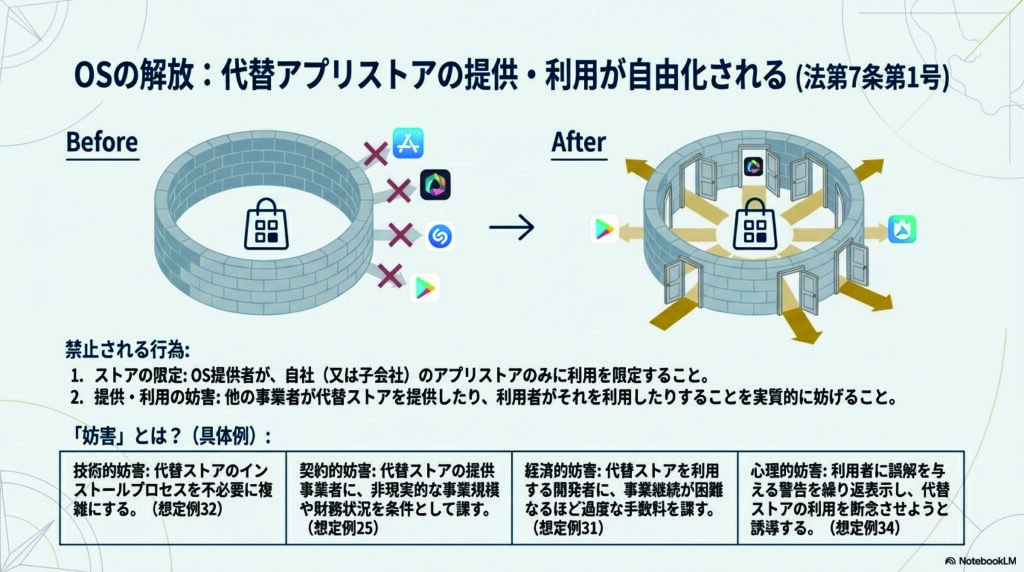 - 提供・利用の妨害:他社が代替ストアを提供したり、利用者がそれを使ったりすることを“実質的に”妨げること