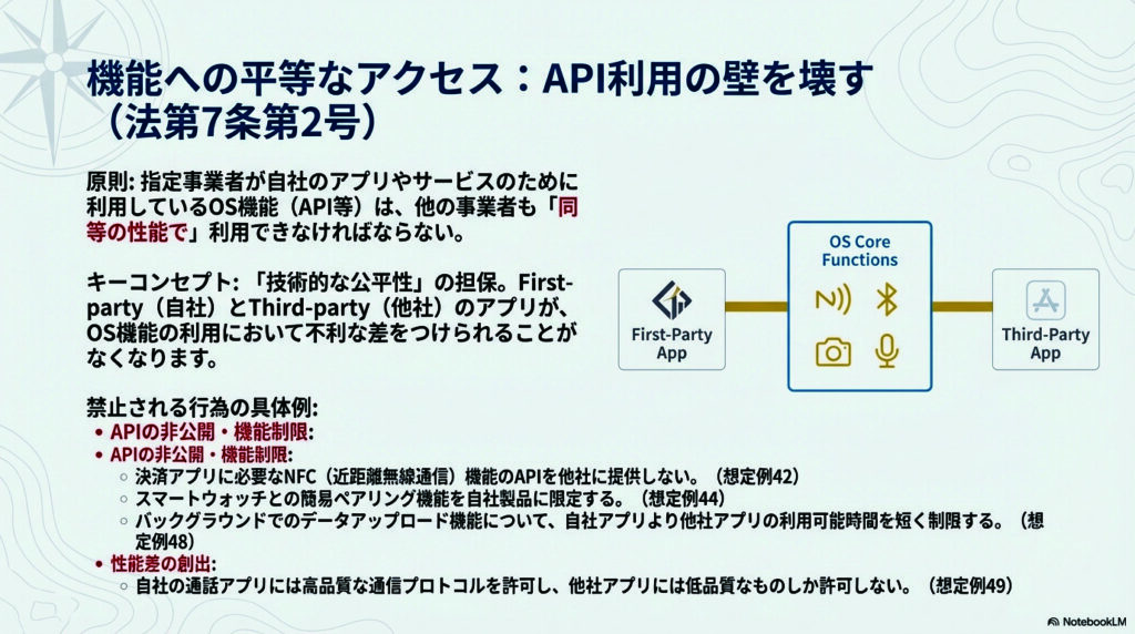 - OS機能(API)を、他社も同等性能で使える方向(法第7条第2号)
