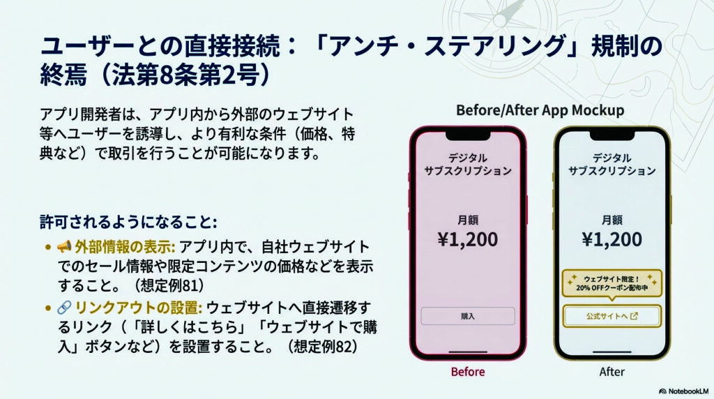 下の画像では、アプリ内から外部のウェブサイト等へユーザーを誘導し、より有利な条件(価格、特典など)で取引することが可能になると整理されています。