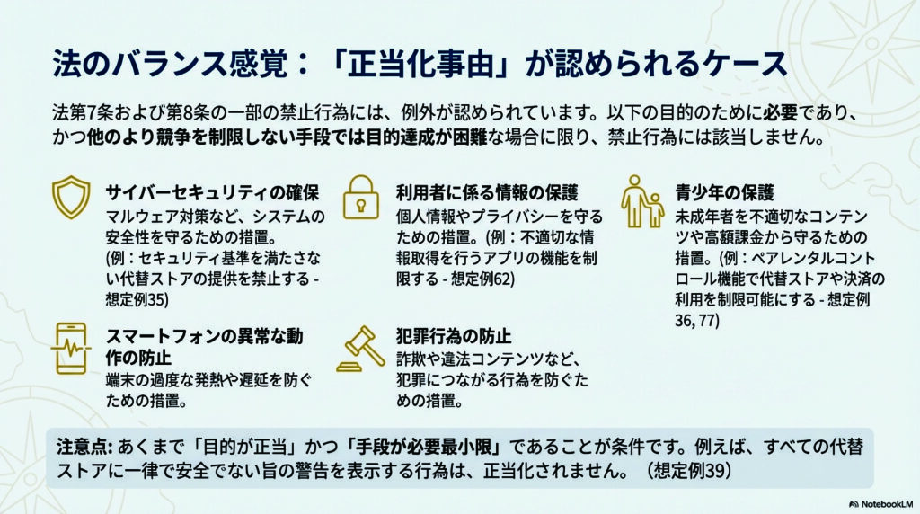 - 一方で、サイバーセキュリティ確保などの正当化事由がある場合、必要最小限の制限はあり得る(正当化事由)