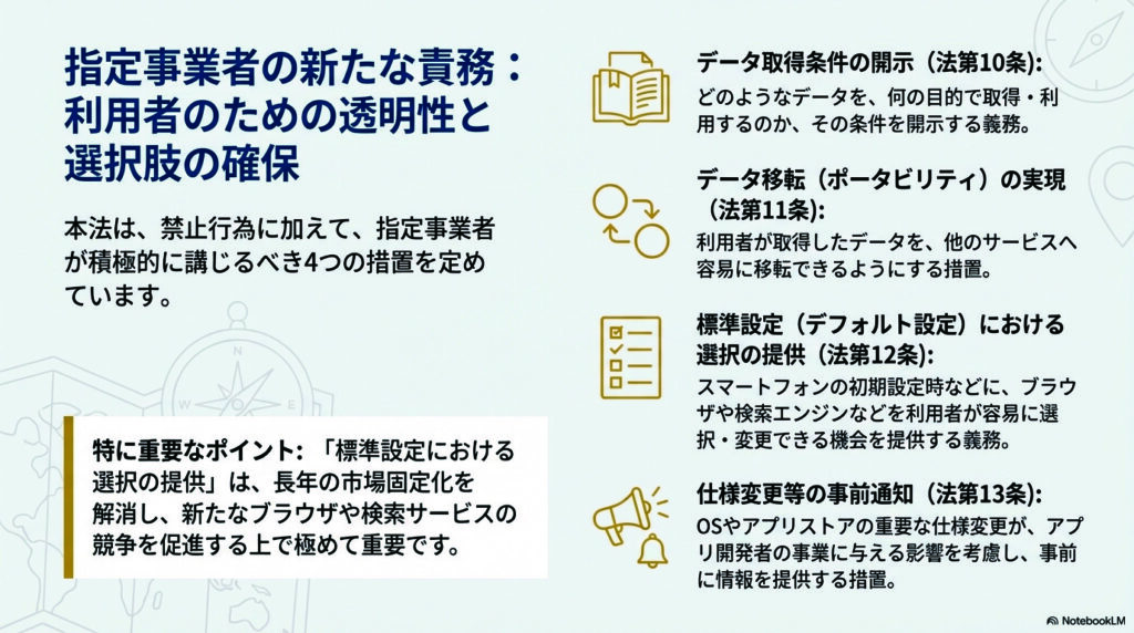 下の画像は、禁止行為の列挙で終わらず、指定事業者が積極的に講じるべき措置(義務)を4つ示しています。