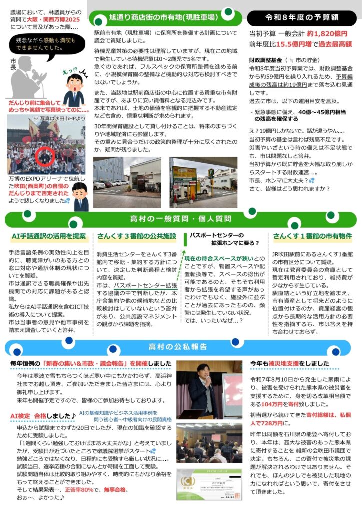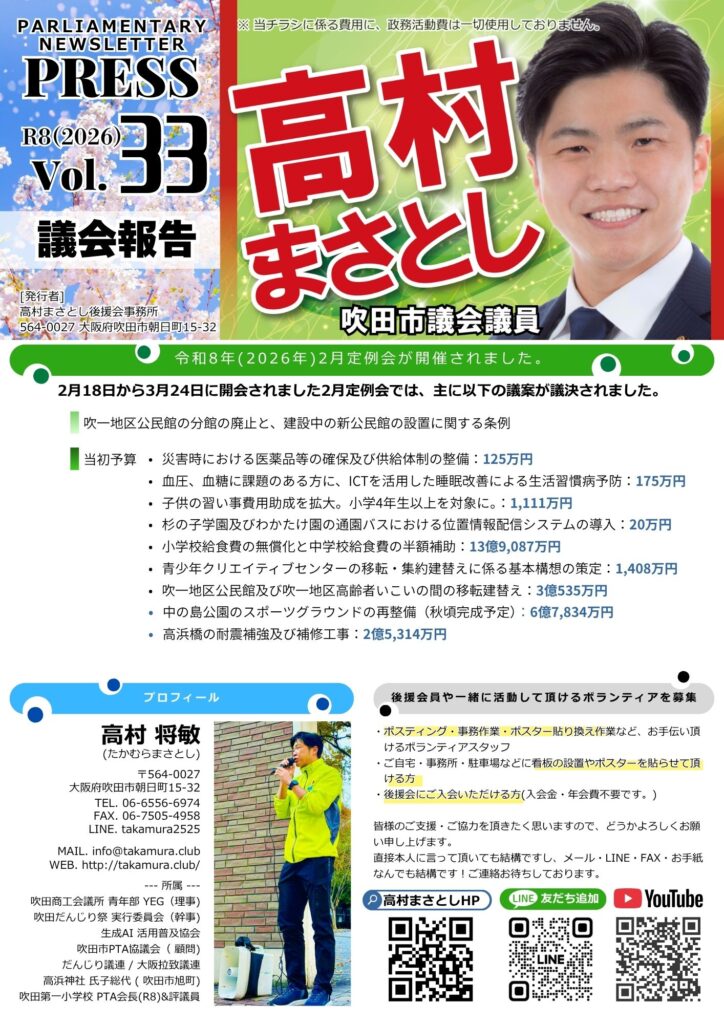 2026年2月定例議会 高村まさとし 議会報告プレス33 2026 3/24 議会報告 PRESS 本日議会が閉会し、令和8年(2026年)2月の定例会号 「高村まさとし 議会報告PRESS-33」が完成しましたので、掲載しておきます。 この投稿について、「頑張ってるね!」と思っている人が多いみたいですね。参考にします!(^^)この記事について、あなたはどう思いましたか?どうかしてるぜ (0)なんとも思わない (0)まだまだだね (0)全然ダメだね (0)オモロイやん (0)勉強不足 (0)興味なし (0)この記事もっと掘り下げて欲しい (0)同じこと思っててん (0)まぁまぁ頑張ってるね (0)え~事言うなぁ (0)笑いも起きない記事だわ (0)共感する (0)がんばれ (0)よくわからん (0)難しいね (0)普通 (0)ありがたいね (0)怒り心頭 (0)ワロタ (0)頑張ってるね! (1) 議会報告 PRESS プレス 議会報告 この記事が気に入ったら いいね または フォローしてね! Follow @win2pro Follow Me 是非シェアしください♪ URLをコピーする URLをコピーしました! URLをコピーしました! 2025年11月定例議会 高村まさとし 議会報告プレス32 関連記事 2025年11月定例議会 高村まさとし 議会報告プレス32 2025年12月22日 [会派広報誌] 令和7年(2025年)9月定例会 2025年12月14日 [会派広報誌] 令和7年(2025年)5月定例会 2025年10月3日 2025年9月定例議会 高村まさとし 議会報告プレス31 2025年10月1日 2025年5月定例議会 高村まさとし 議会報告プレス30 2025年7月2日 [会派広報誌] 令和7年(2025年)2月定例会 2025年4月14日 2025年2月定例議会 高村まさとし 議会報告プレス29 2025年3月24日 [会派広報誌] 令和6年(2024年)11月定例会・新春号 2024年12月20日