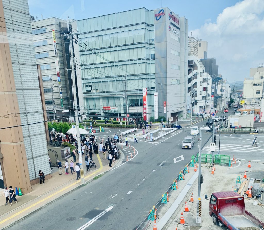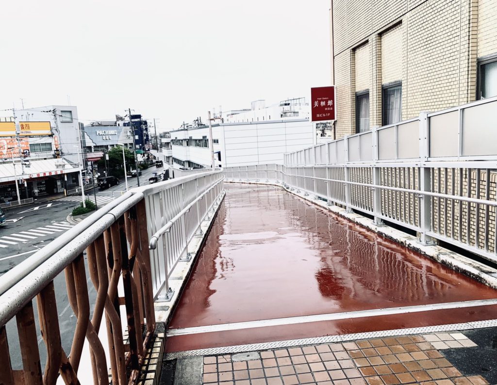 JR吹田駅中央口のエスカレーターに繋がる通路が、雨でわかりにくいですが、耐震工... -